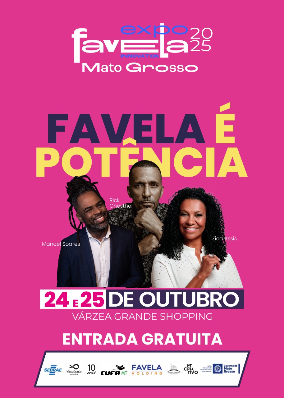 A Expo Favela Innovation Mato Grosso, que será realizada nos dias 24 e 25 de outubro, no Espaço de Eventos Várzea Grande Shopping, já confirmou três grandes nomes que prometem inspirar o público com trajetórias de superação, inovação e impacto social: Rick Chesther, Zica Assis e Manoel Soares.